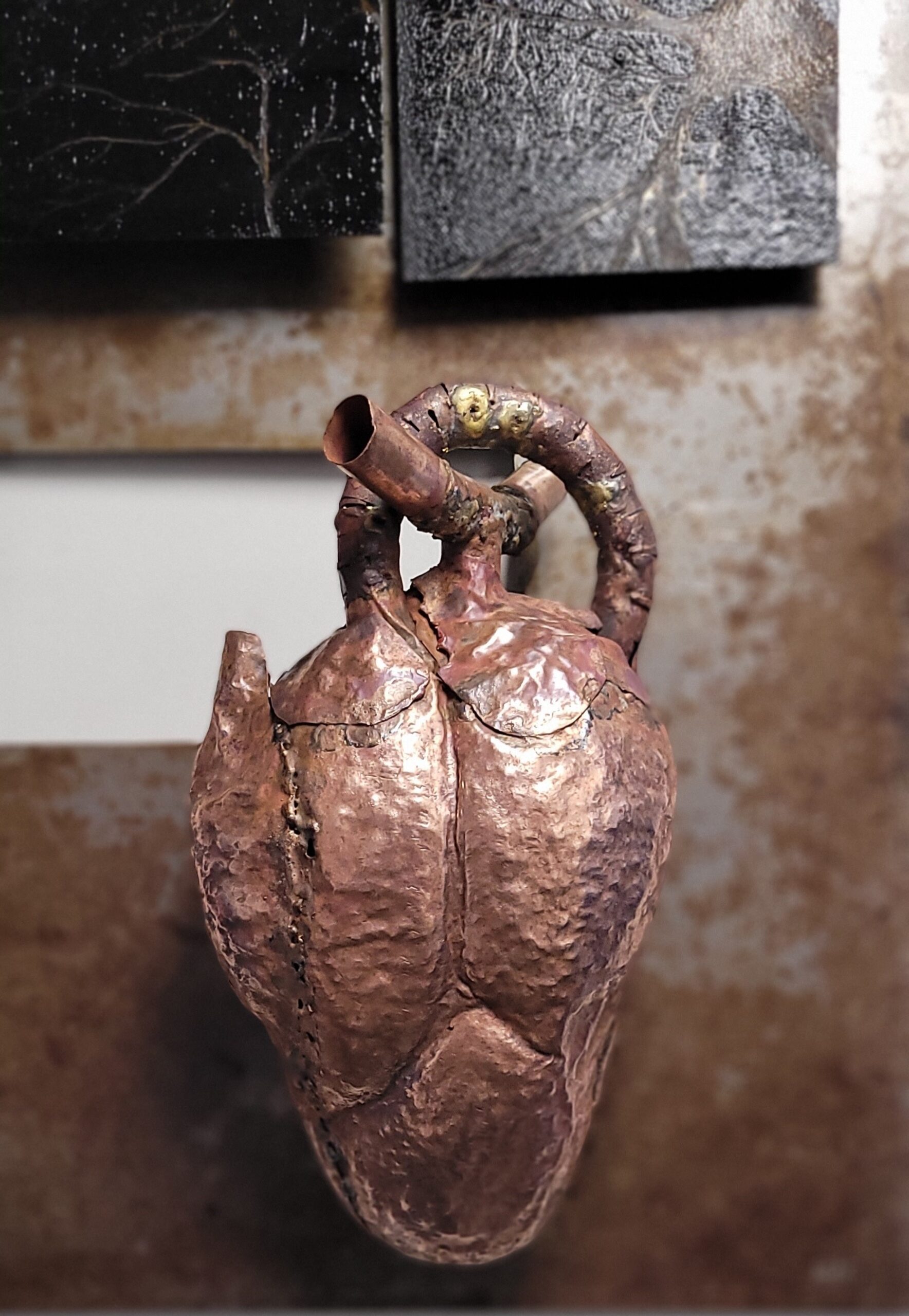 Concebida no pós-pandemia, ‘Aeris Cor’ surgiu do desejo de expressar o orgânico/visceral. O trabalho nasceu como um desafio e, simultaneamente, como aprendizado de técnicas para forjar o metal. Segundo Marco Caetano, “a escultura nasceu de algo que é recorrente em minha mente: o que somos, o que possuímos por dentro, o que nos ocupa anatomicamente”.
