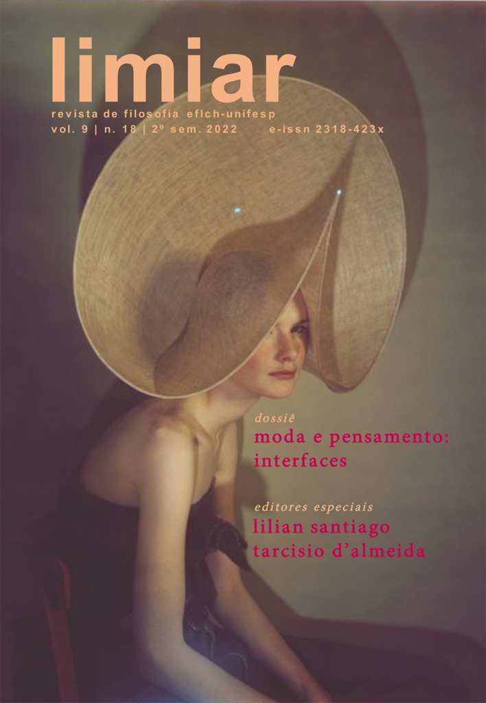 É com grande entusiasmo que a Comissão Editorial e, em especial, os editores especiais convidados Profa. Dra. Lilian Santiago (do Curso de Filosofia da EFLCH-UNIFESP) e Prof. Dr. Tarcisio D’Almeida (do Curso de Design de Moda da EBA-UFMG) anunciam o lançamento do Dossiê “Moda e Pensamento: Interfaces” da “Limiar: Revista de Filosofia EFLCH UNIFESP”, vol. 9, n. 18, segundo semestre de 2022, que estreia nova direção de arte e projeto gráfico assinado por Tarcisio D’Almeida. A publicação está disponível no seguinte link: https://periodicos.unifesp.br/index.php/limiar/issue/view/897
