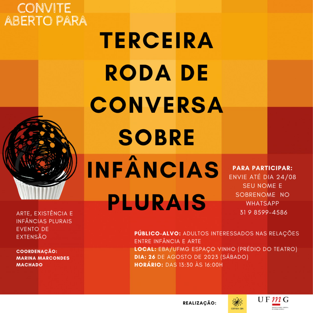 Neste terceiro encontro, vamos conversar sobre diferentes assuntos relativos à infância, com foco inicial nos adultos ao redor das crianças e possíveis transtornos psíquicos das figuras cuidadoras, tematizando a necessidade da comunidade adulta trabalhar em rede de apoio, e saber conversar com as crianças, em caso de adoecimento na família, lembrando sempre do direito da criança à verdade. As conversas são sempre iniciadas/aquecidas com um ato performativo curto, preparado cuidadosamente pelo Núcleo de Pensamento e Ações que compõe o evento de extensão “Arte, existência e infância plural”. Todos os interessados em discutir infâncias são bem vindos.